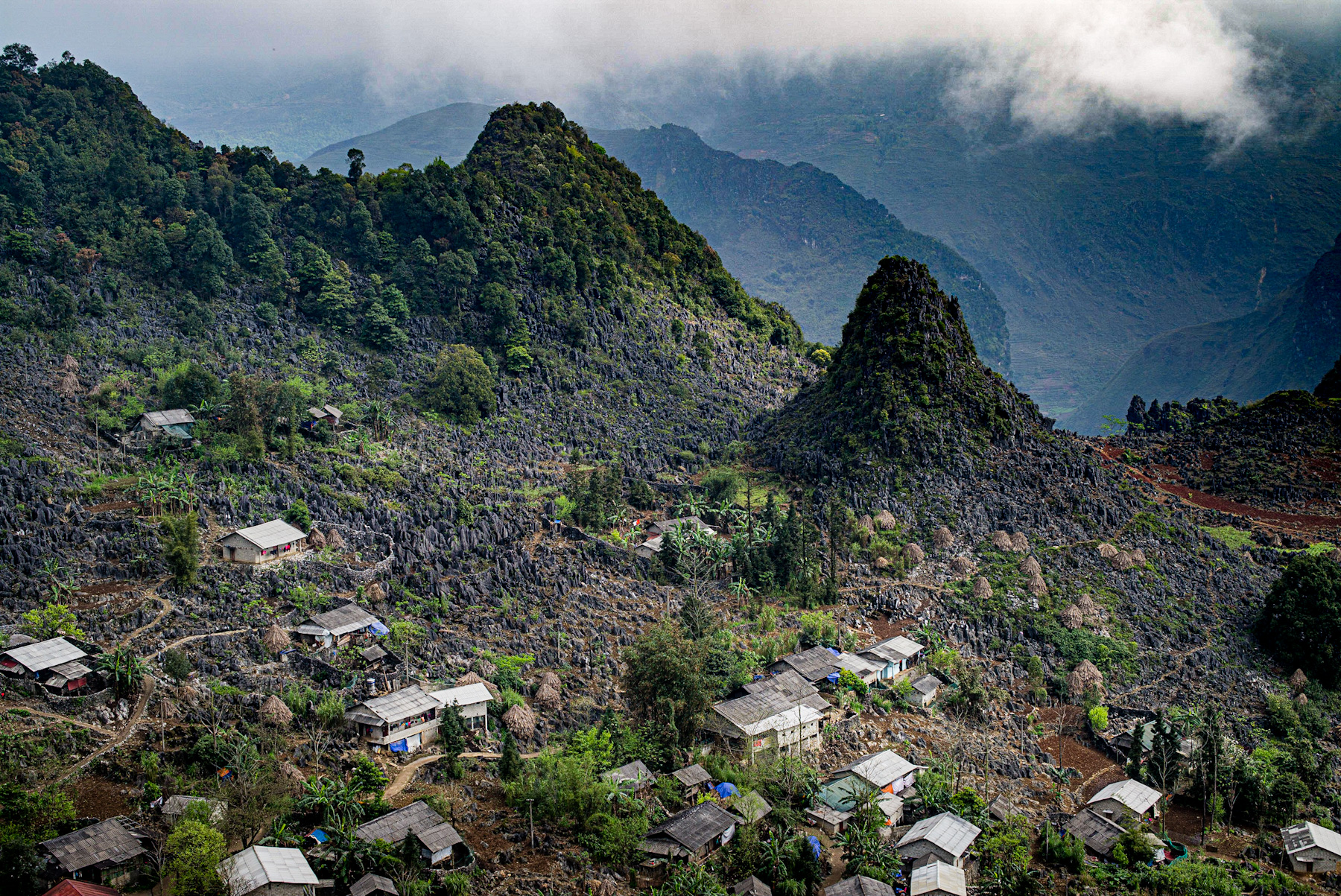 Imagine a world sculpted by nature's raw power: towering, jagged limestone peaks reaching for the sky, their upper slopes draped in lush greenery, while below, ancient grey rock faces tell tales of time. Tucked within this dramatic embrace are homes, their simple forms … Continue Reading ››