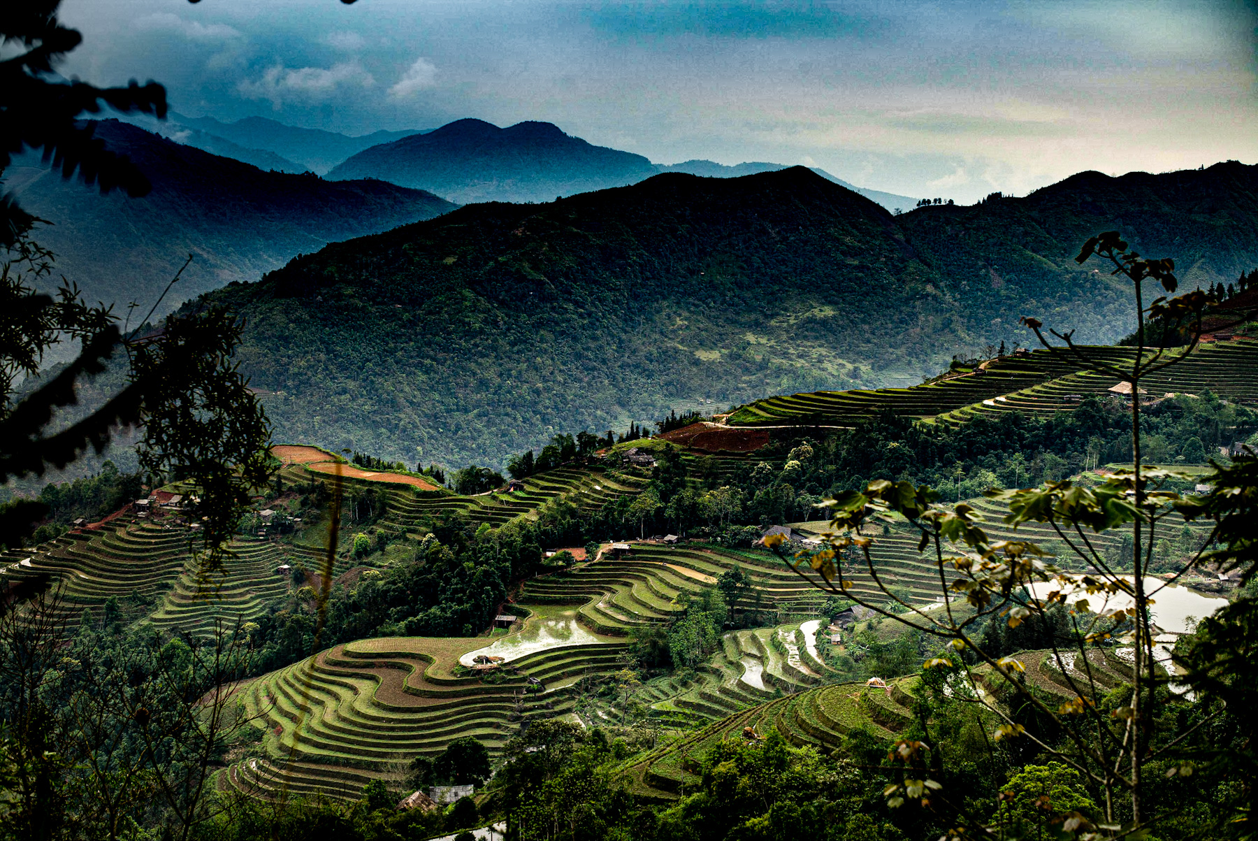 The image presents a panoramic view of lush, meticulously sculpted rice terraces cascading down steep mountain slopes. Layers of verdant green follow the contours of the land, some fields filled with water, reflecting the soft light of the sky. In the background, successive … Continue Reading ››