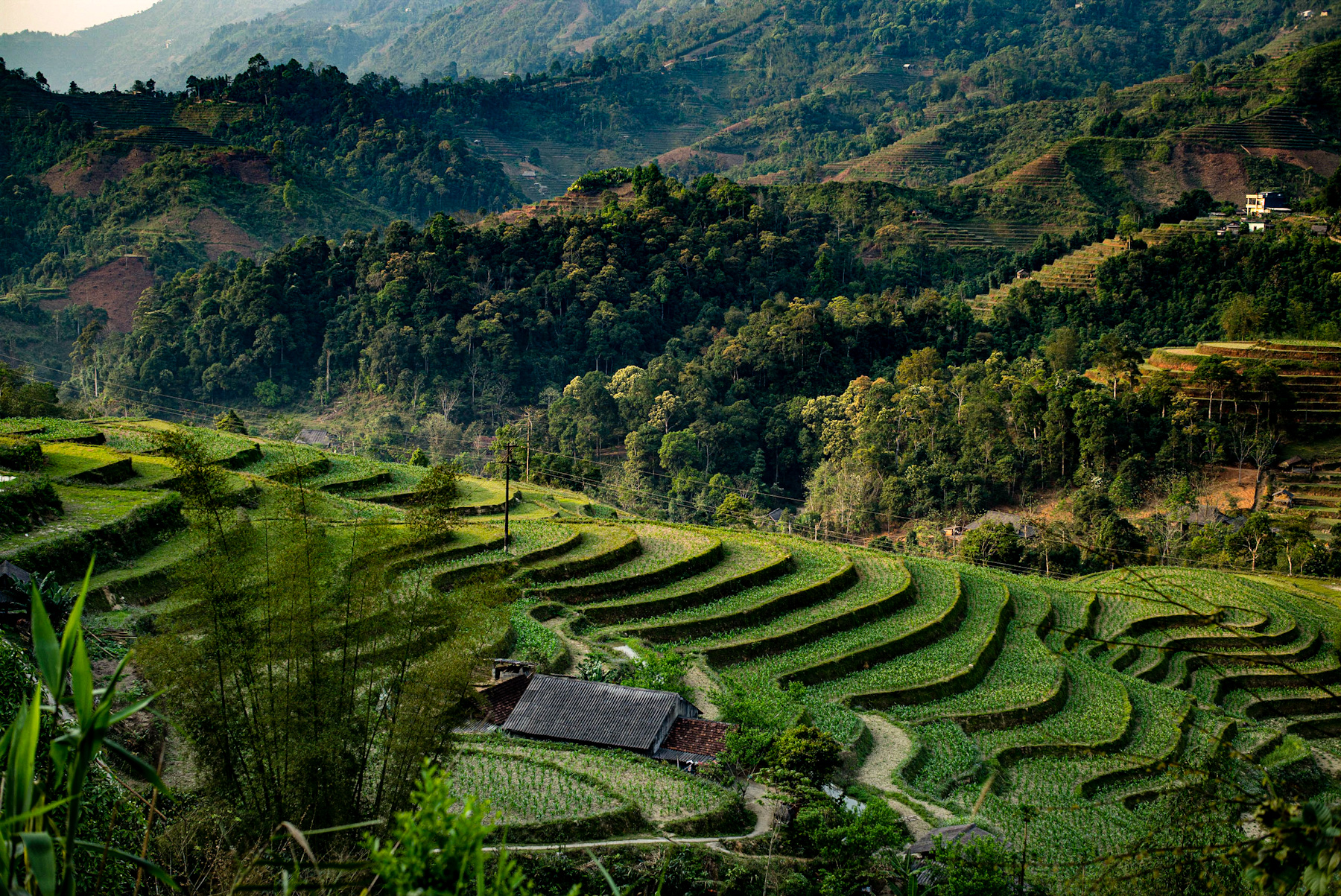 The image presents a breathtaking panorama of terraced fields meticulously carved into verdant mountain slopes. Layers of vibrant green cultivation ascend the hillsides, creating an intricate, wave-like pattern that speaks to both natural beauty and profound human endeavor. Lush forests dominate the higher elevations, providing a dramatic backdrop to the agricultural tapestry below. A few traditional homes, characterized by their dark roofs, are nestled discreetly within the landscape, signifying a harmonious coexistence between inhabitants and their environment. The soft, natural light illuminates the contours, emphasizing the depth and scale of this remarkable scene.