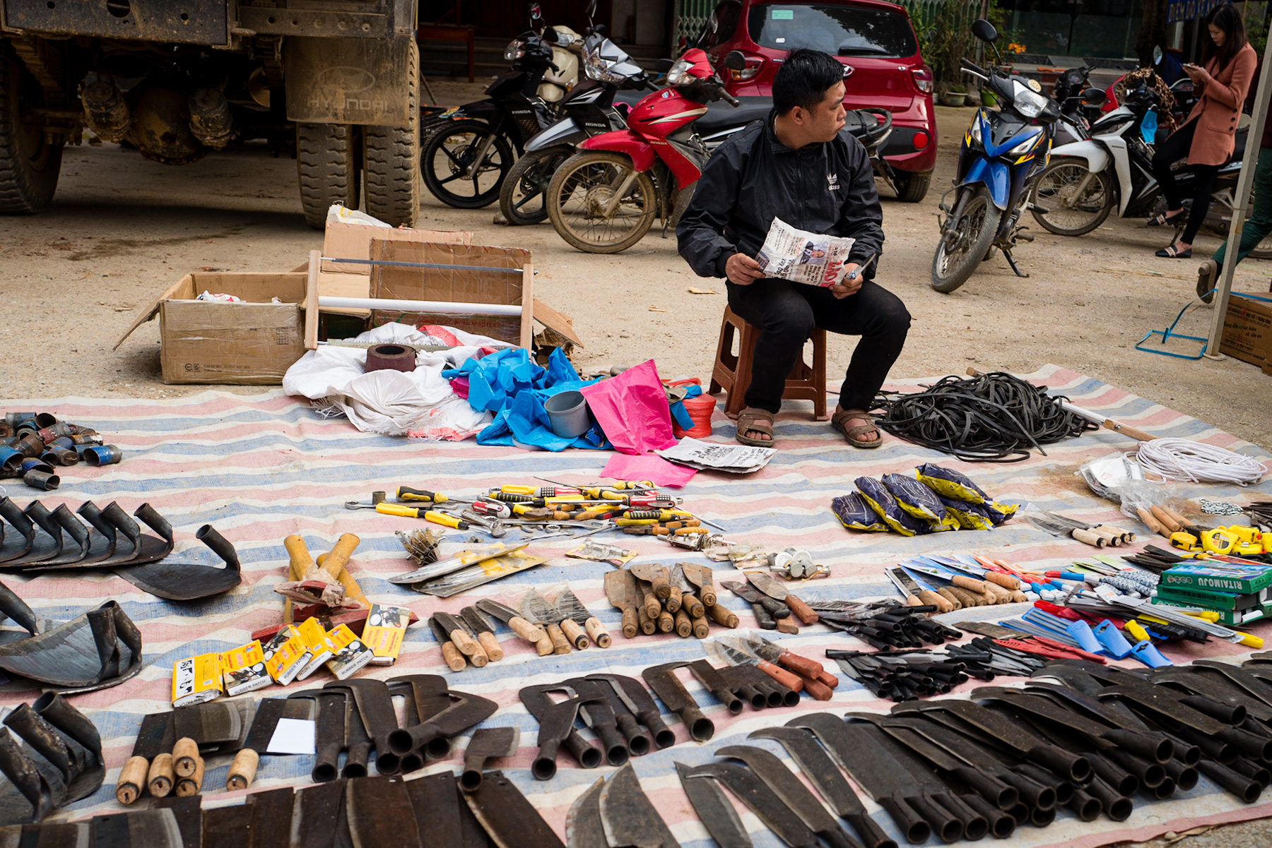 The image captures a vibrant street market scene, likely in Southeast Asia, bustling with activity. At its heart lies a meticulously arranged display of **agricultural and utility tools**, offering a fascinating blend of the old and the new.