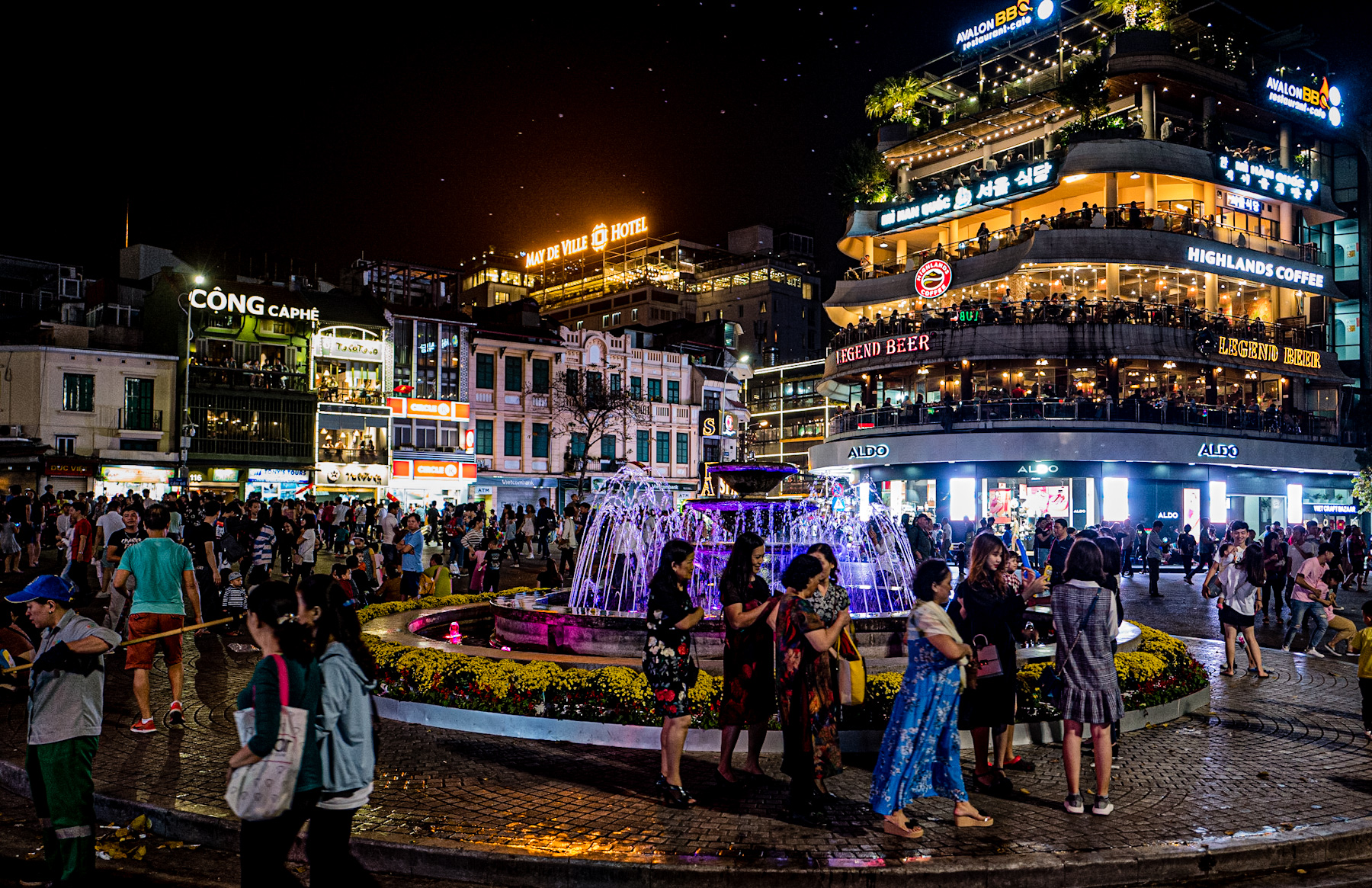 The image paints a vivid picture of Hanoi's nightlife, showcasing a captivating blend of the modern and the historical. The scene centers around a dynamic fountain, its waters playfully illuminated with vibrant purple hues, drawing the eye and serving as a focal point … Continue Reading ››