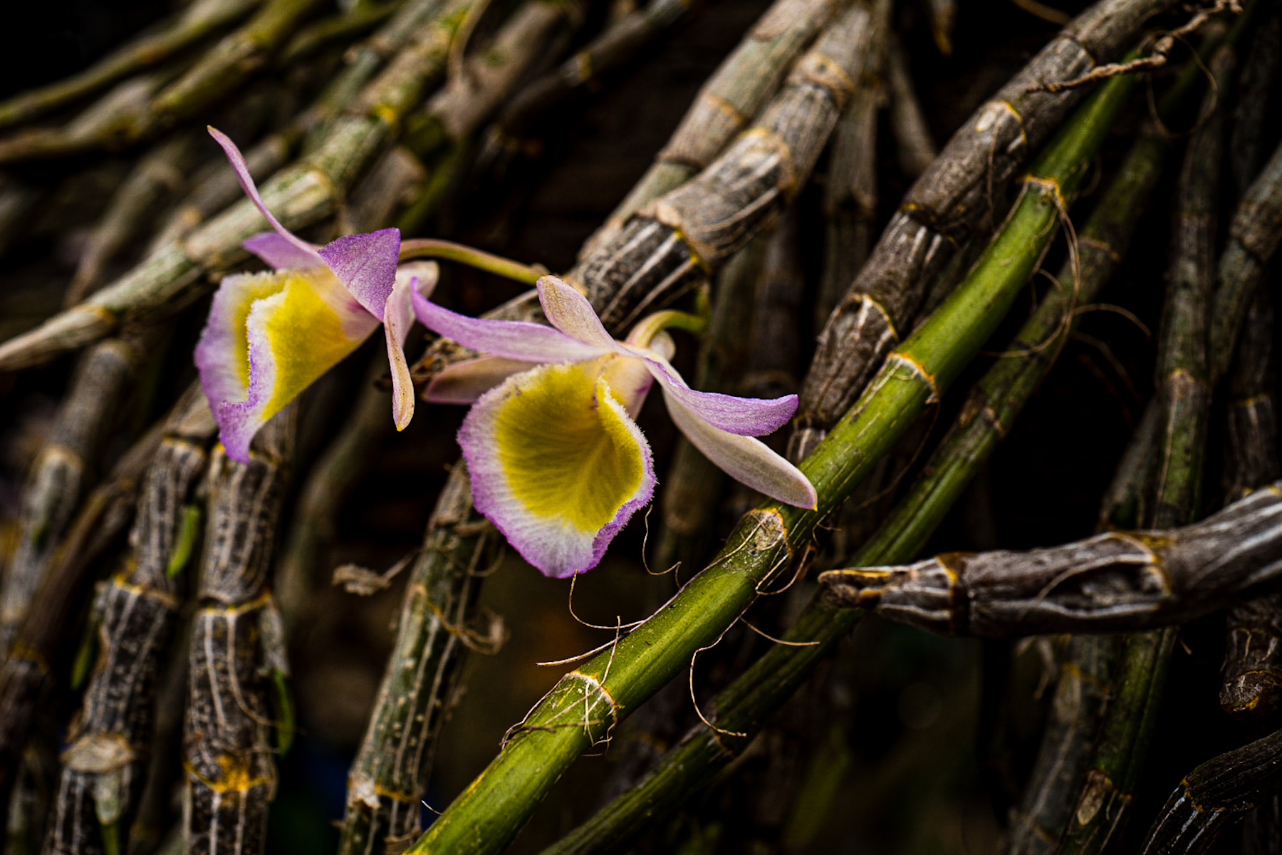 The image captures a delicate cluster of Dendrobium orchids, their slender, often cane-like pseudobulbs forming a textured backdrop. The blossoms, with their characteristic lavender-purple petals and vibrant yellow centers, stand out against the darker, woody stems. Fine aerial roots, characteristic of many epiphytic … Continue Reading ››