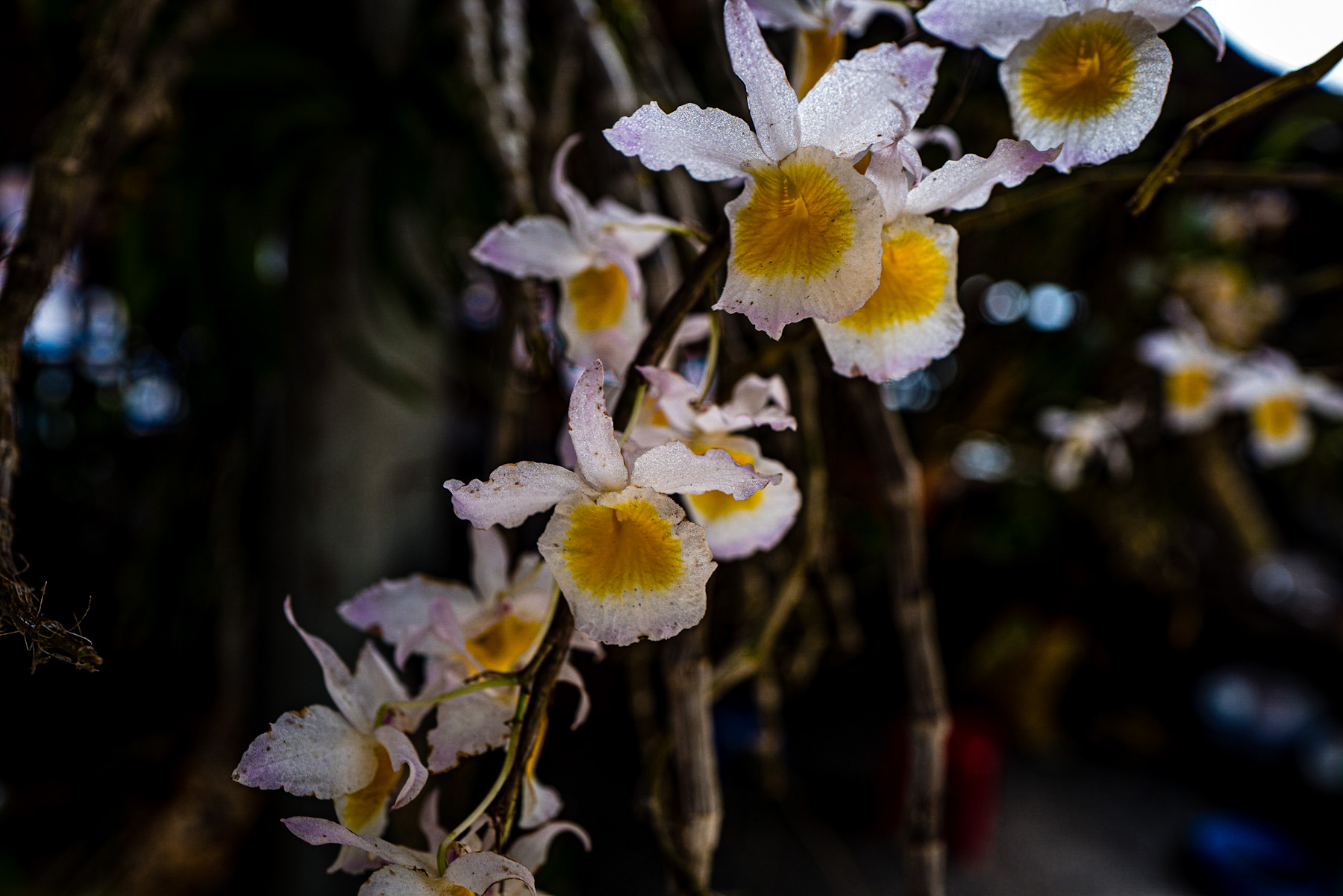 Cascading against a dark, natural backdrop, the delicate blooms of the **Dendrobium orchid** command attention. The image captures a cluster of these intricate flowers, their white and pale lilac petals appearing almost translucent and dusted with a fine, crystalline texture. Each flower is … Continue Reading ››