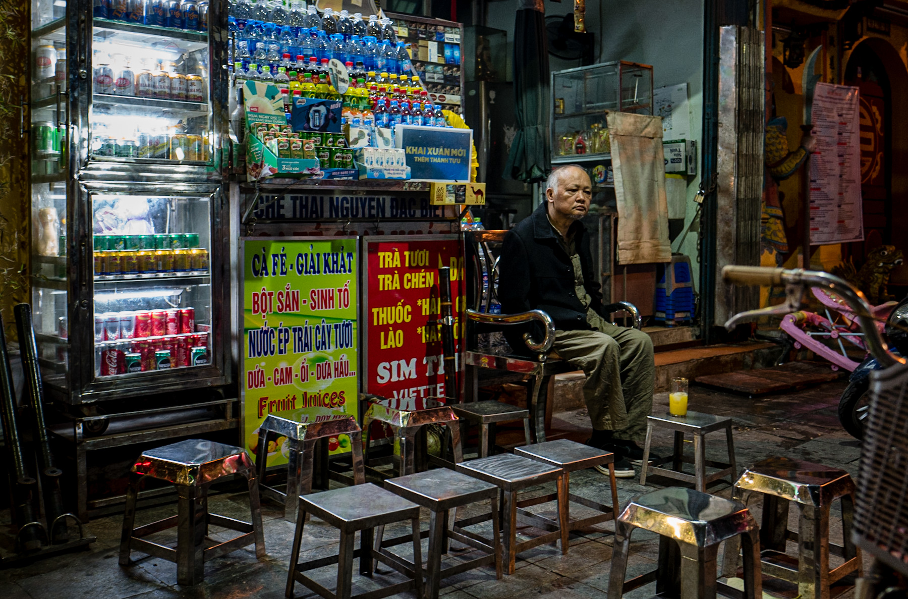 The photograph captures a poignant moment in an urban Vietnamese setting, likely an evening scene. An elderly man, the central figure, sits contemplatively on a polished chrome chair, his gaze directed outwards, perhaps observing the street’s ebb and flow. Surrounding him is a vibrant, yet humble, street-side refreshment stall. Illuminated display cases showcase an array of bottled beverages and canned goods, from popular soft drinks to local essentials like Milo and Nescafe. Colourful signs in Vietnamese advertise „Coffee – Refreshments,“ „Smoothies,“ and „Fresh Fruit Juices,“ highlighting the diverse offerings. A cluster of small, utilitarian metal stools awaits customers, one holding a glass of what appears to be freshly squeezed juice, inviting patrons to pause and partake in the urban rhythm.