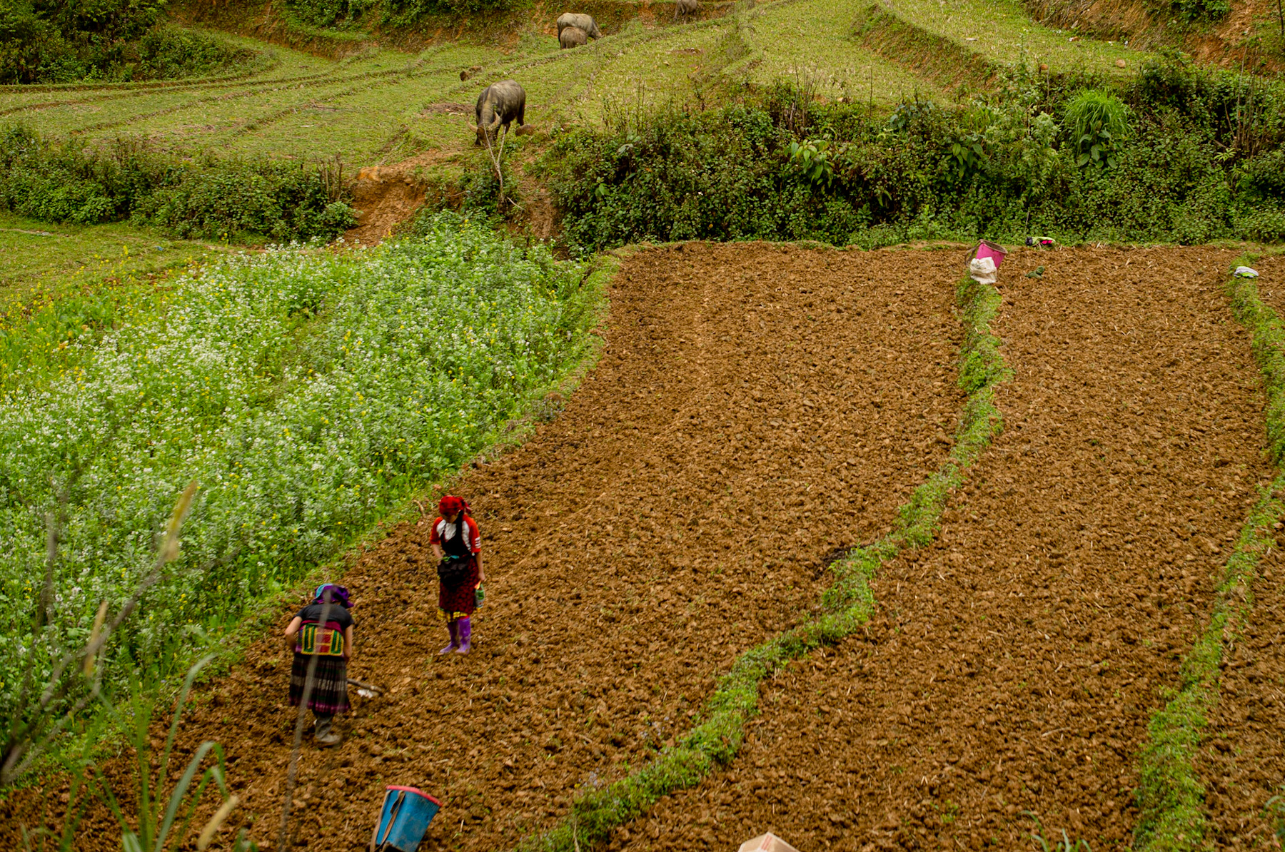 Further up the slope, water buffalo graze, underscoring another integral element of traditional farming. For millennia, these powerful animals have served as indispensable draft animals, plowing fields and aiding in the preparation of land far more effectively than manual labor alone. Their presence highlights the enduring symbiotic relationship between humans, animals, and the land that defines traditional subsistence farming.