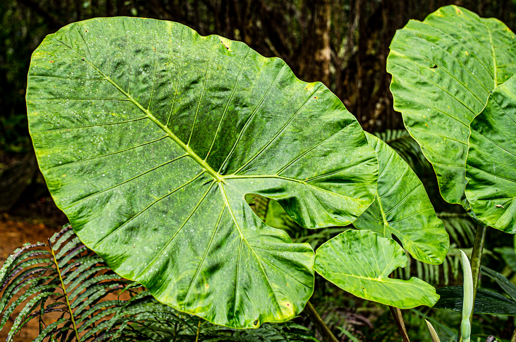 The image captures the vibrant essence of a tropical undergrowth, dominated by the expansive, heart-shaped leaves characteristic of the Araceae family, commonly known as Elephant Ear plants (Alocasia, Colocasia, or Xanthosoma species). Their lush green surface, dappled with what appears to be morning dew or recent rainfall, showcases prominent venation, emphasizing their robust structure. The surrounding foliage, including delicate fern fronds and the dark outlines of tree trunks, suggests a rich, humid ecosystem, likely a rainforest or a dense botanical garden. The sheer scale of these leaves provides a striking visual testament to the vitality of tropical biodiversity.