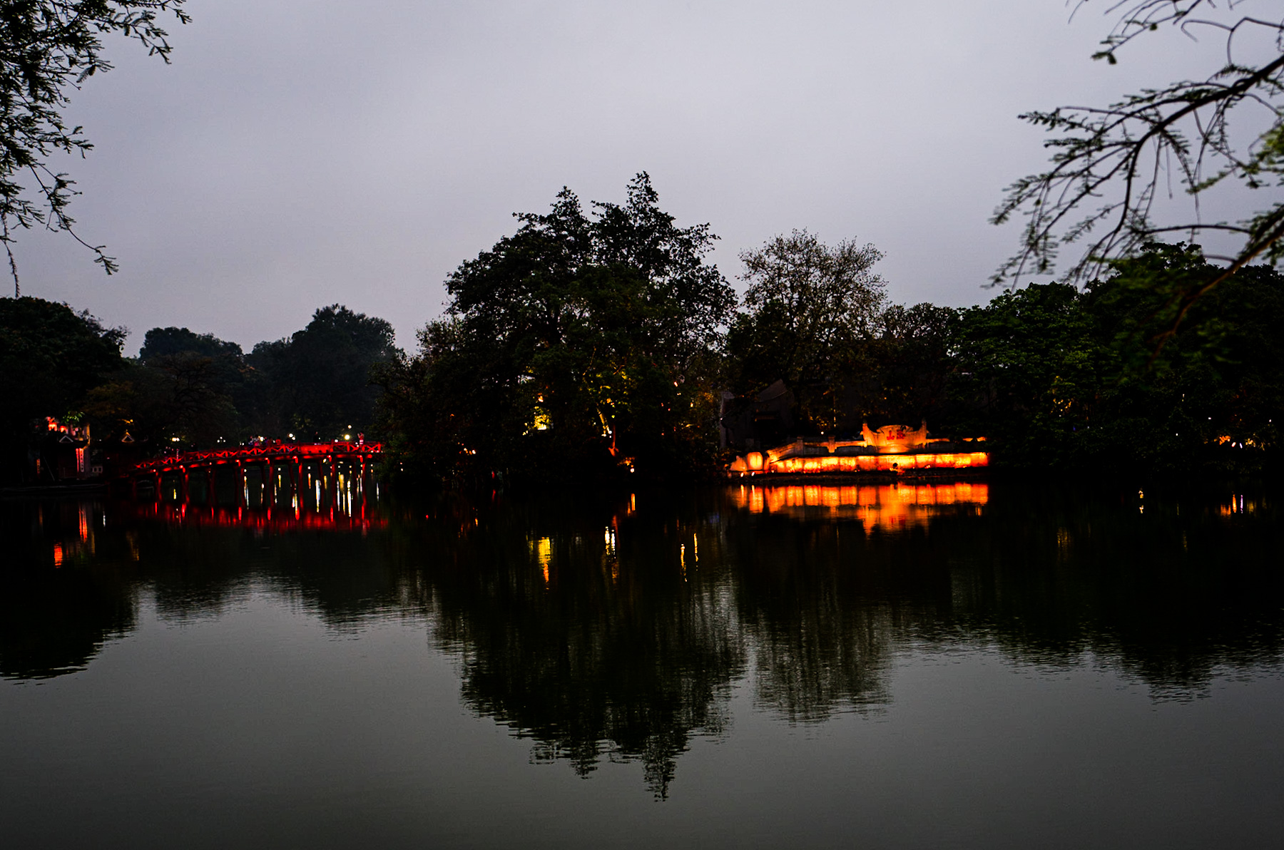 As dusk settles over Hanoi, a serene and almost mystical scene unfolds at its very heart: Hoan Kiem Lake. This isn’t just a body of water; it’s a living canvas where the fading daylight gives way to the warm, artificial glow of history, reflecting deeply on its calm, mirror-like surface. Imagine ancient trees silhouetted against a twilight sky, their forms mirrored perfectly in the water, alongside the iconic structures that make this location a cornerstone of Vietnamese culture.