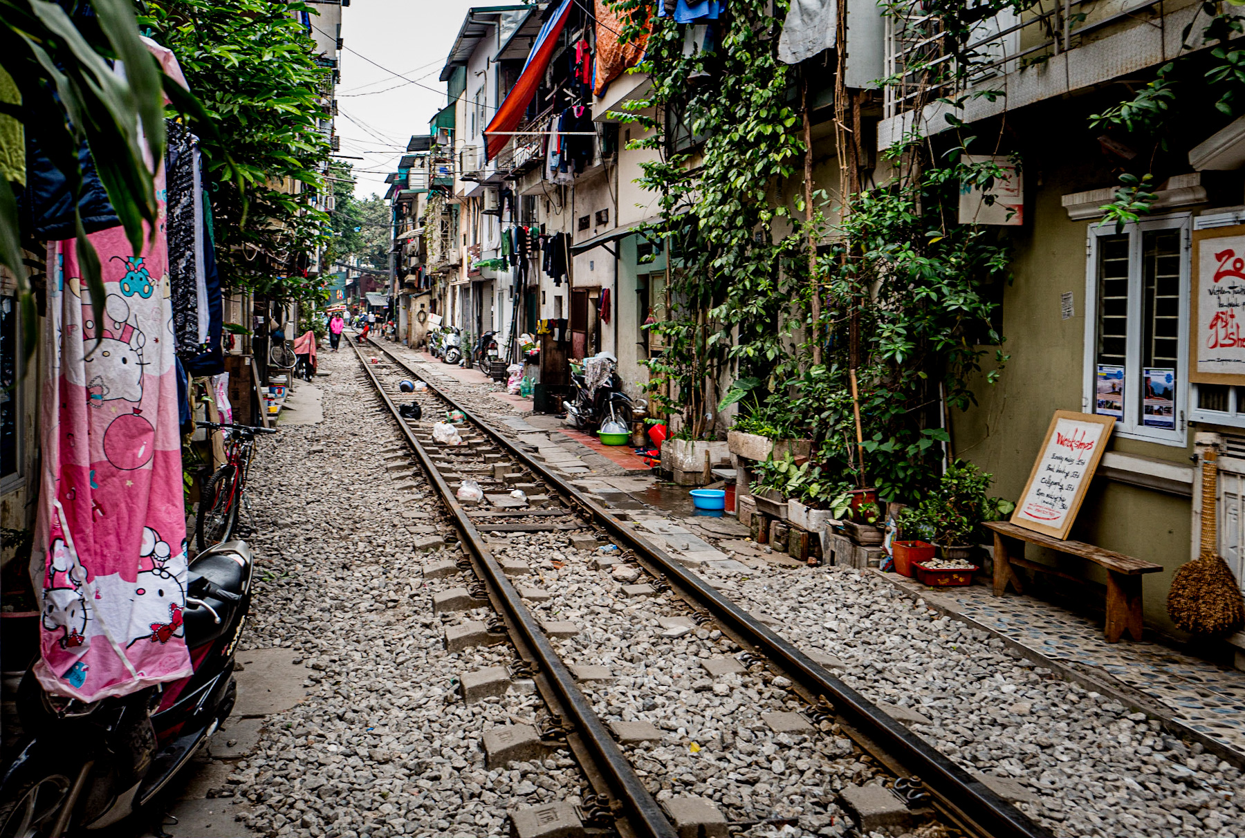 The captivating image reveals a quintessential scene from a bustling Southeast Asian city, where train tracks cut directly through a narrow residential and commercial corridor. On either side, multi-story buildings stand in close proximity, their facades adorned with verdant climbing plants and the everyday spectacle of hanging laundry. Motorbikes, a ubiquitous mode of transport, are parked along the edges, testament to the vibrant street life that coexists with the railway. A closer look reveals signs of local commerce and daily routines, from potted plants decorating doorsteps to hand-written chalkboards advertising workshops, inviting passersby into the unique rhythm of this urban landscape.