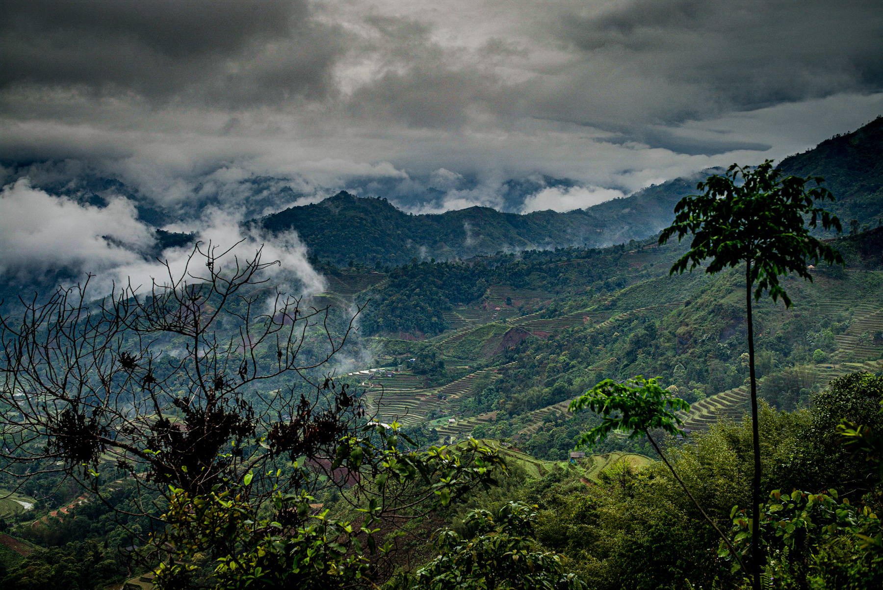 The captured image presents a dramatic mountain landscape, where verdant slopes ascend into a sky dominated by heavy, low-hanging clouds. Wisps of mist frequently shroud the distant peaks, creating an ethereal and somewhat mysterious atmosphere that partially obscures the horizons. In the immediate foreground, skeletal trees with bare branches offer a stark, artistic contrast to the pervasive greenery, while a single, vibrant tree stands prominently, its rich foliage adding depth to the scene. The overall impression is one of raw natural beauty, underscored by the dynamic interplay of light, shadow, and atmospheric conditions.