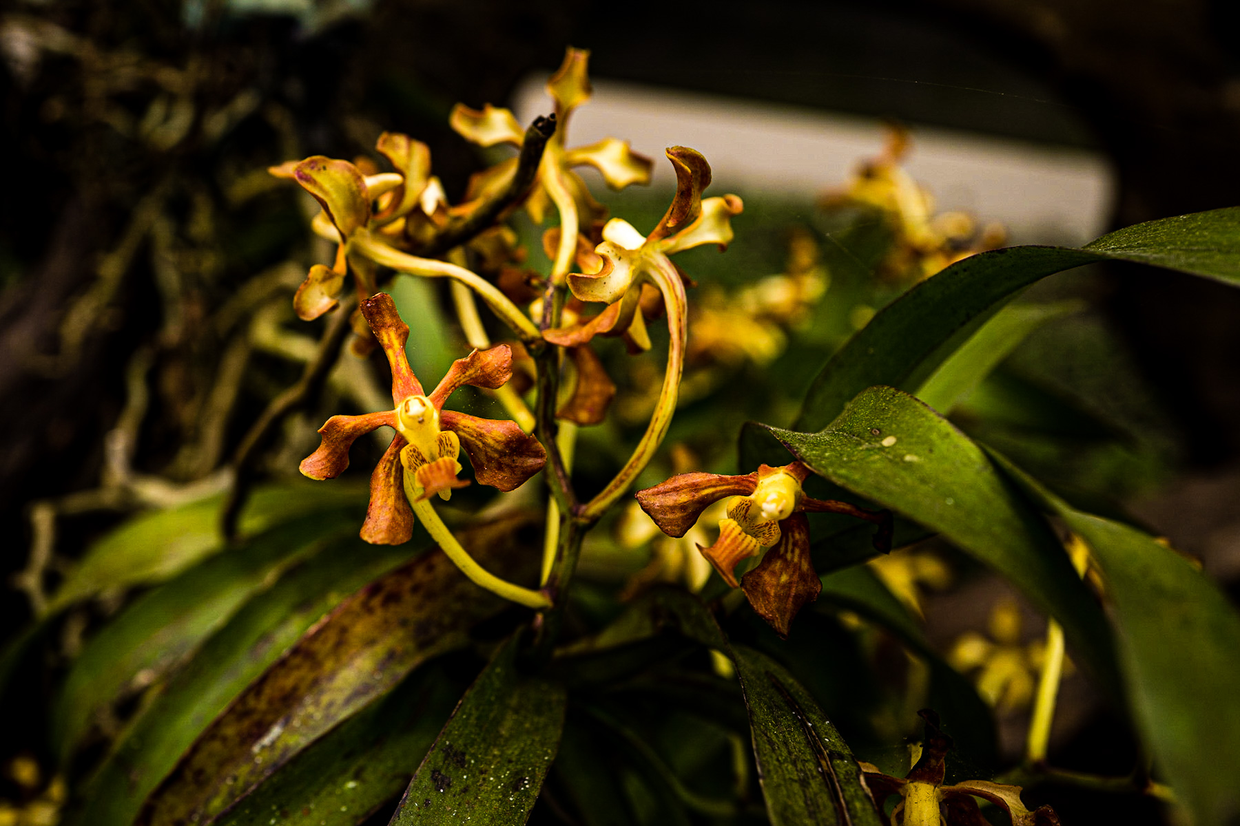 The accompanying image presents a captivating close-up of an orchid cluster, showcasing its intricate beauty. Rich tones of burnt orange and deep yellow dominate the foreground blooms, their unique, almost star-like petals unfurling with delicate precision. Vibrant green foliage provides a natural frame and a subtle contrast, while a shallow depth of field artfully blurs the background, hinting at a lush, verdant environment. This focused perspective emphasizes the delicate structures and subtle textures of these exotic flowers.