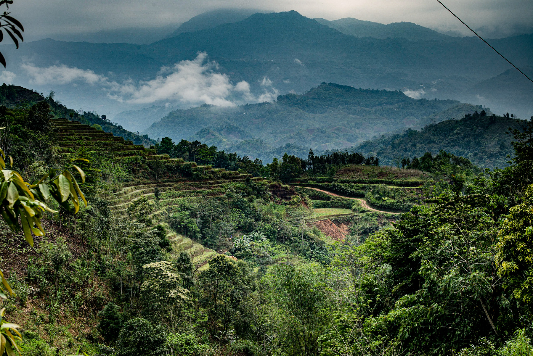 The image unveils a breathtaking canvas: a vast, verdant mountainous landscape where steep slopes are intricately woven with a network of terraced fields. Layers of mountains, softened by a gentle mist, recede into the distance under an overcast sky, evoking a profound sense of depth and tranquility. In the foreground, dense, lush foliage frames the meticulously arranged agricultural terraces that dominate the mid-ground. A winding dirt path hints at the persistent human activity embedded within this remote, beautiful setting.