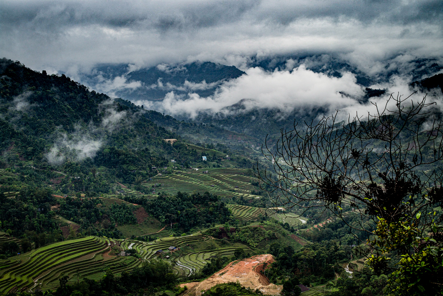 The breathtaking sight of Vietnam’s mountain landscapes is more than just a pretty picture; it’s a testament to centuries of human endeavor. Imagine layers of vibrant, green rice terraces meticulously carved into steep hillsides, creating a stunning, intricate pattern. Above them, misty clouds gently kiss distant mountain peaks, lending an ethereal touch to an already majestic scene. Dense forests cloak the higher elevations, gradually giving way to these cultivated fields, dotted with scattered homes that speak of a resilient life amidst nature’s grandeur. A striking, bare-branched tree often stands in the foreground, framing an expansive view of these ancient agricultural marvels, while hints of reddish earth suggest the dynamic, living environment below.